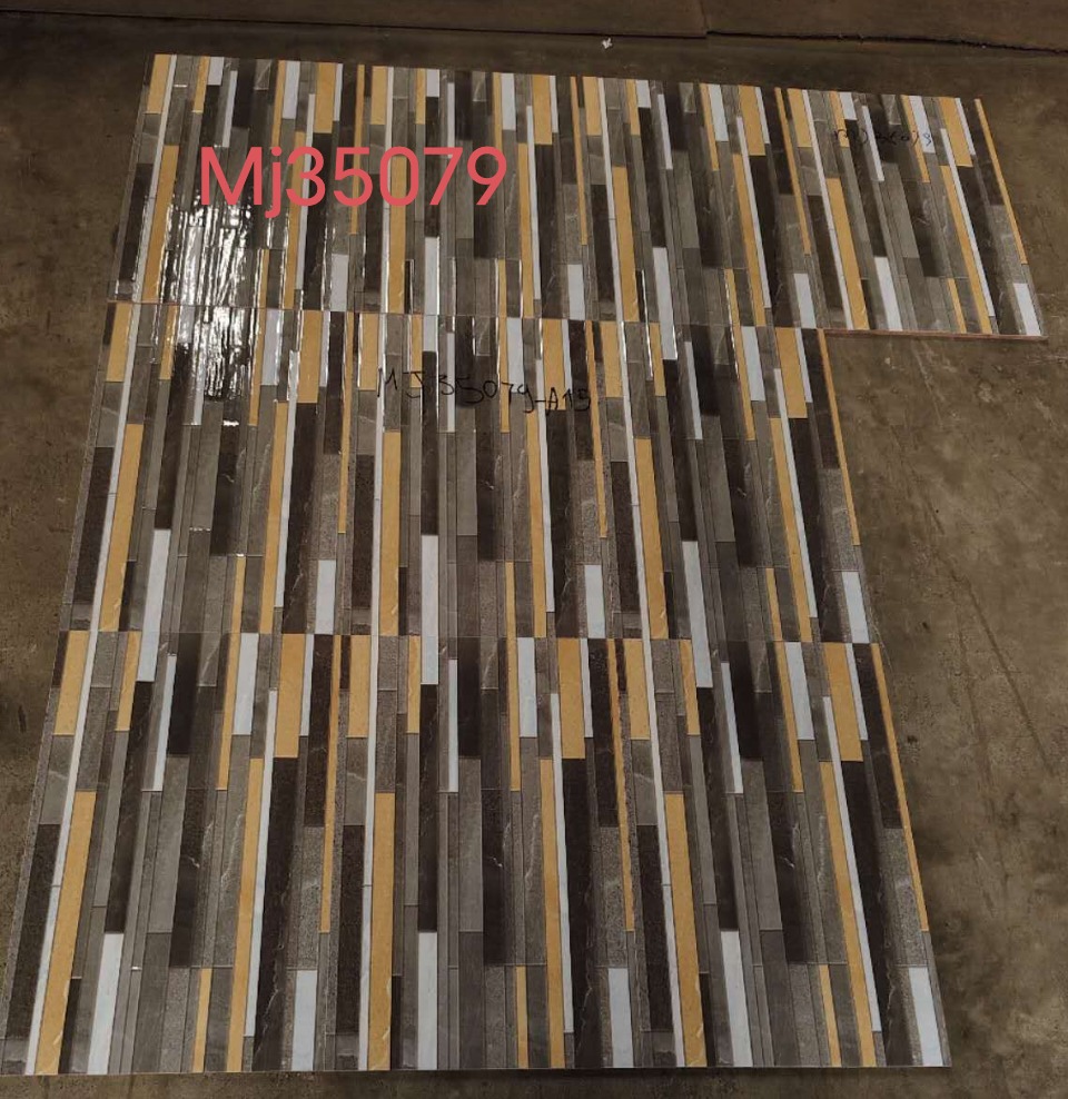 Textura: Peças retangulares estreitas, dispostas verticalmente, com mistura de tons e texturas tipo madeira e pedra