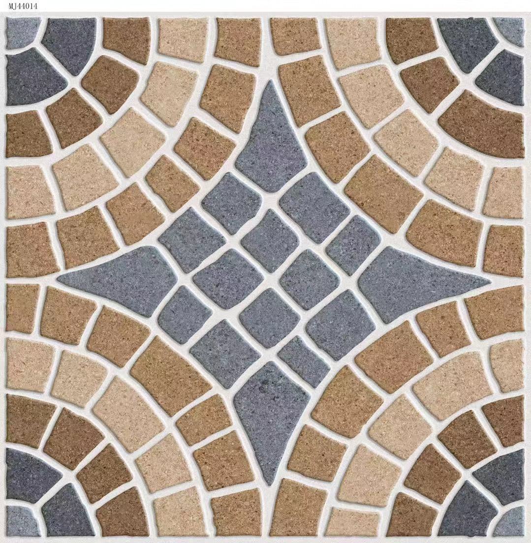 Textura: Padrão em mosaico de peças geométricas irregulares, com quadrados centrais em cinza e formas curvas envolventes em tons quentes, criando contraste e ritmo visual equilibrado.